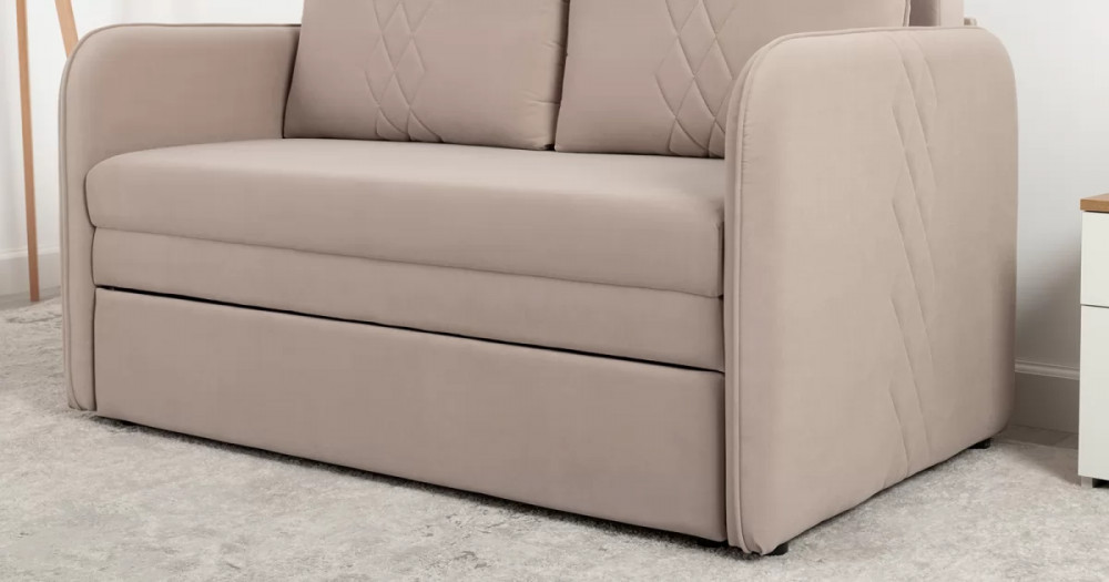 Стильный компактный диван для детской и гостиной. При своих скромных размерах он трансформируется в полноценное спальное место для детей и подростков. Лаконичный дизайн в виде декоративной отстрочки подчеркивает фактуру велюра, а небольшие размеры позволят разместить его в любом пространстве.