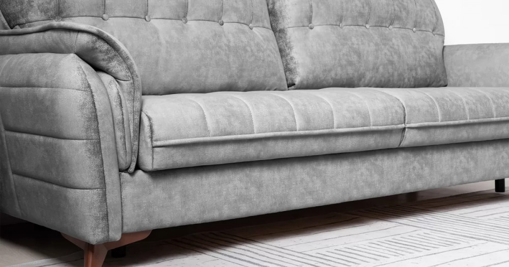 Декоративные канты на подушках дивана, подлокотниках и сиденье. Стежка на передней части сиденья и внешней части подлокотника. Защипы на верхней части подушки. Втяжки с пуговицами на приспинных подушках.