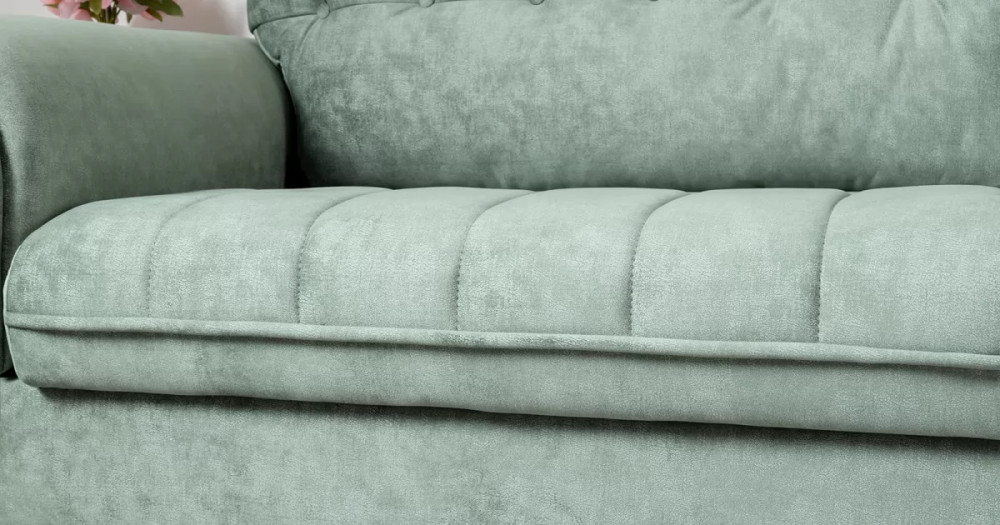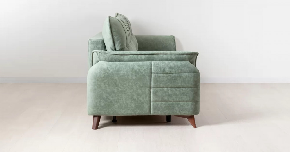 Декоративные канты на подушках дивана, подлокотниках и сиденье. Стежка на передней части сиденья и внешней части подлокотника. Защипы на верхней части подушки. Втяжки с пуговицами на приспинных подушках.