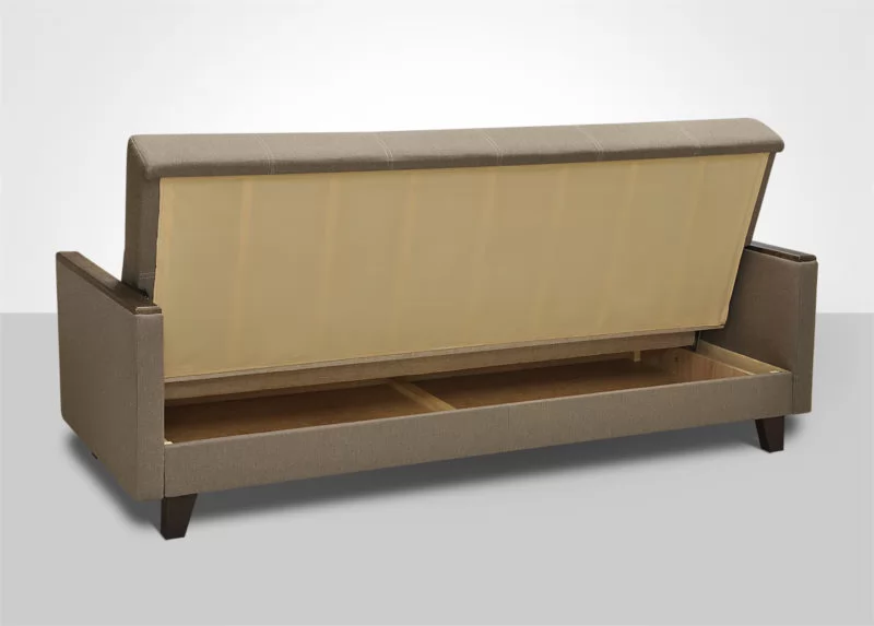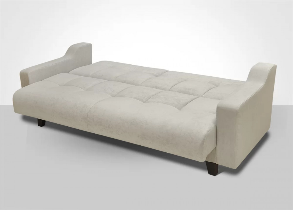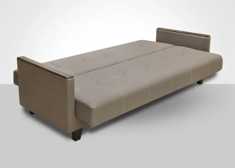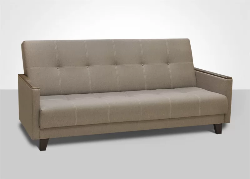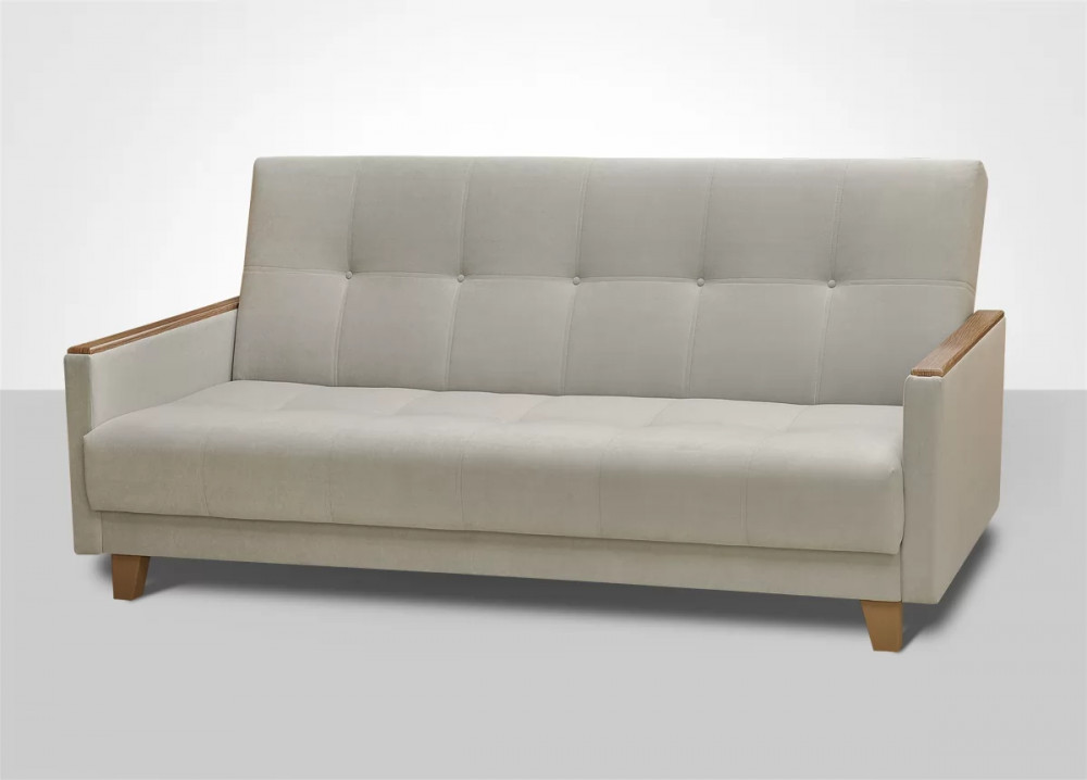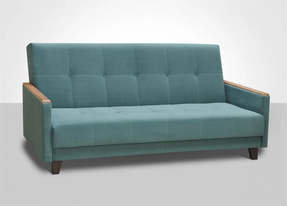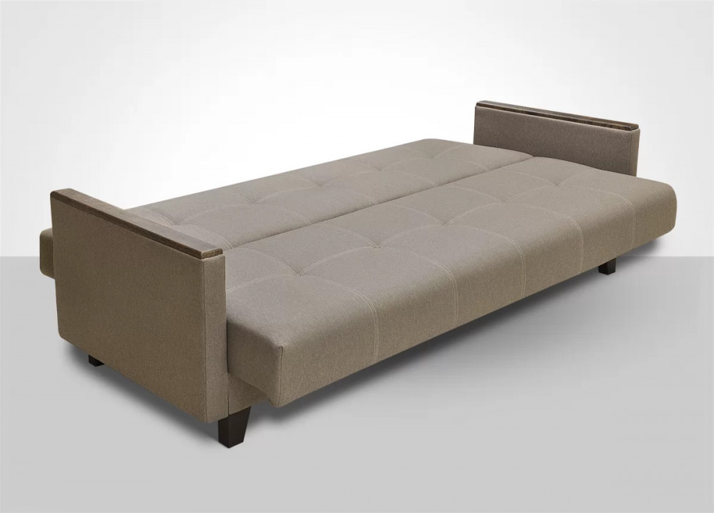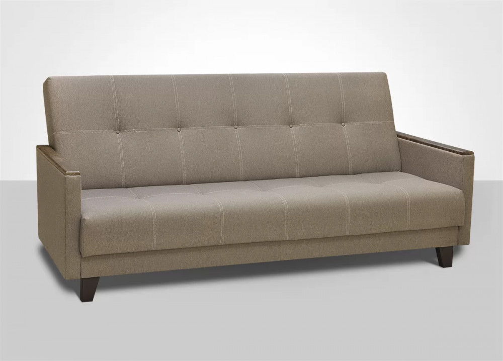 Минималистичный дизайн с прямоугольными  узкими подлокотниками, практичная накладка из ламинированного МДФ под дерево, 10 утяжек пуговиц, контрастная отстрочка.