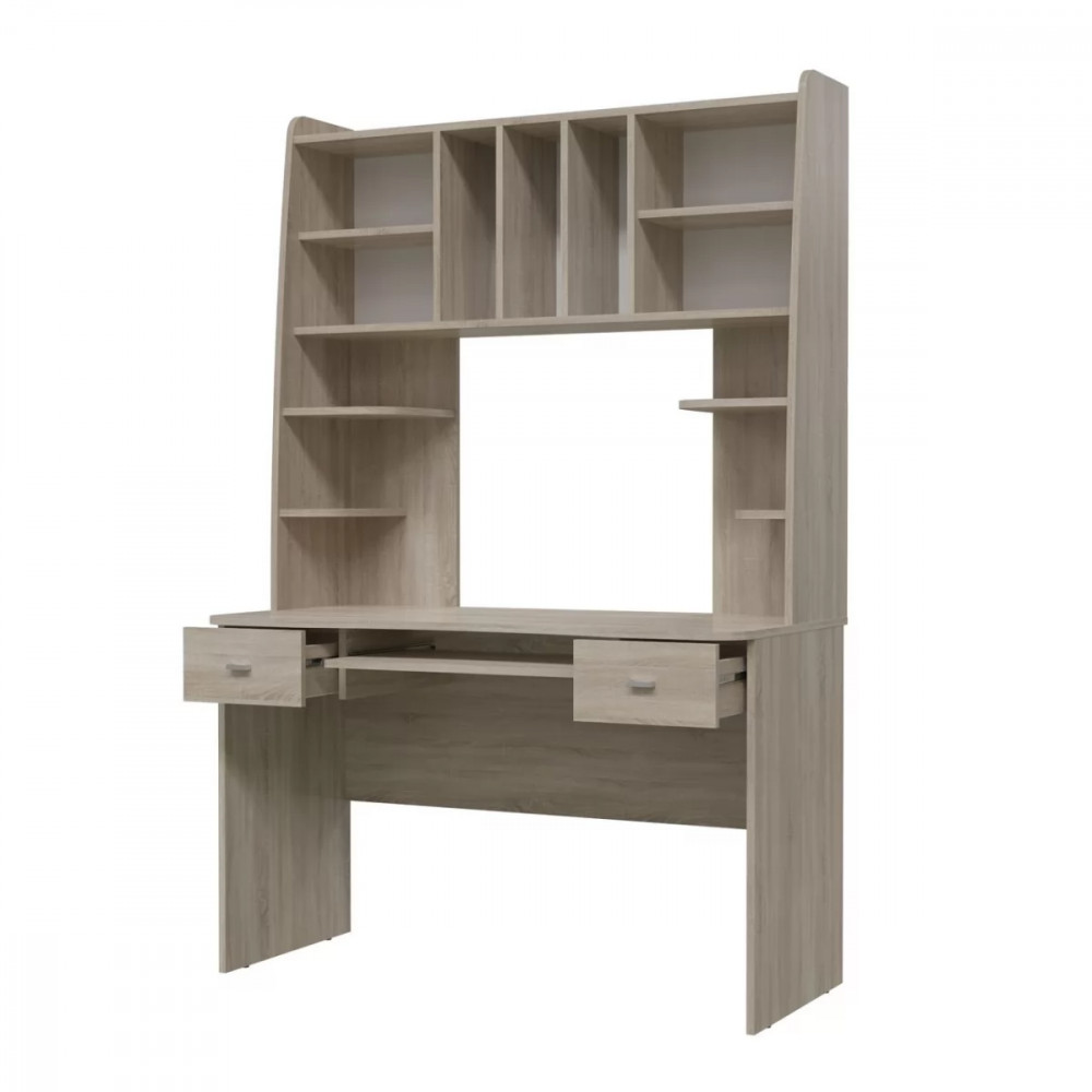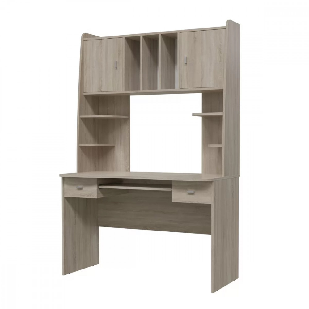 Стол рабочий «Бета» - прекрасное дополнение к молодёжной комнате. Стол оборудован удобными открытыми полочками для различных мелочей, открытыми вертикальными полками для книг и горизонтальными полками за двумя распашными дверями. Также стол оснащён двумя выдвижными ящиками и полкой для клавиатуры.