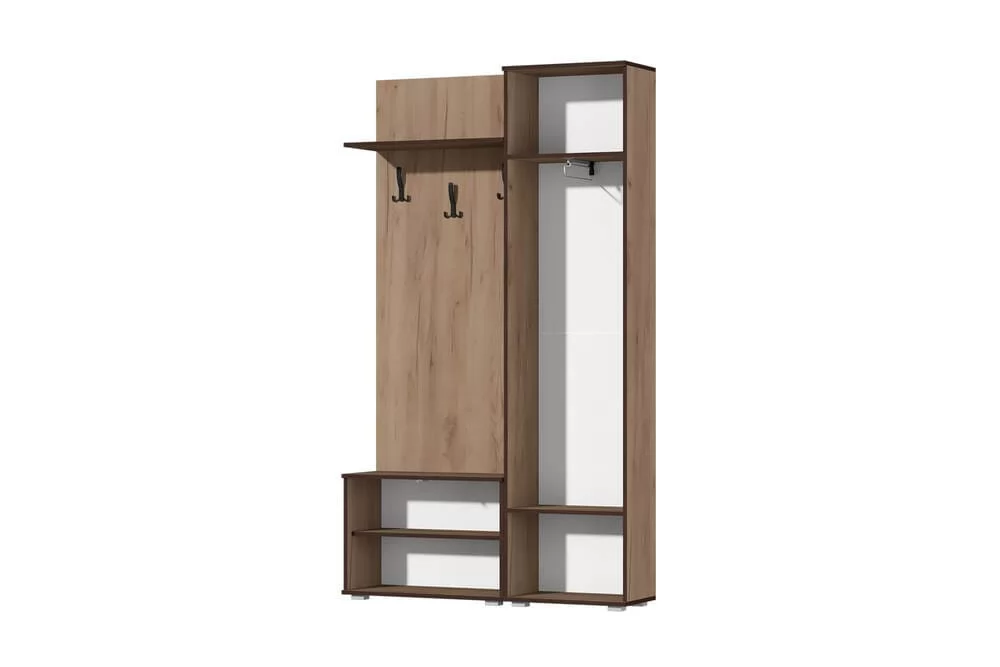 Строгая и элегантная прихожая "Норден" идеально подойдет для небольшого пространства Вашего холла. Все детали изделия отделаны контрастной кромкой (крафт золотой-кромка венге; крафт белый - кромка графит), что в сочетании с черными крючками и металлической ручкой подчеркивает модный дизайн данной прихожей. Дверца обувницы открывается при помощи системы push-to-open (нажатием) и секретерного газлифта.