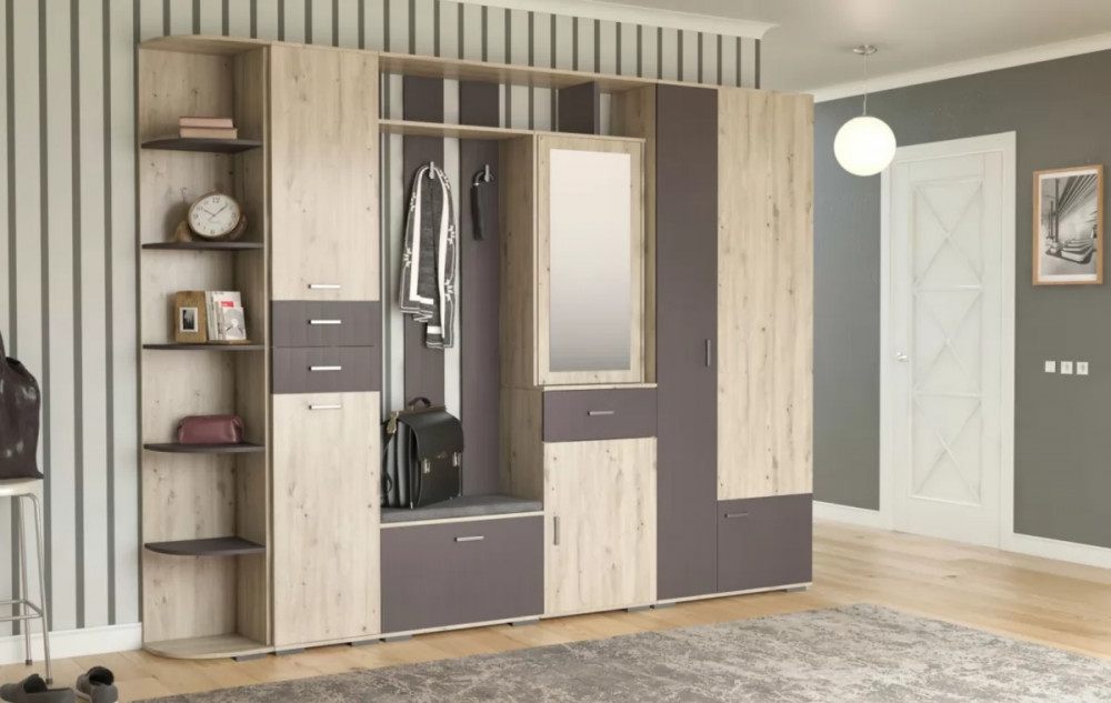 • Состоит из нескольких элементов, которые необходимы в любой прихожей: шкаф для одежды, вешалка, зеркало и тумба для обуви.