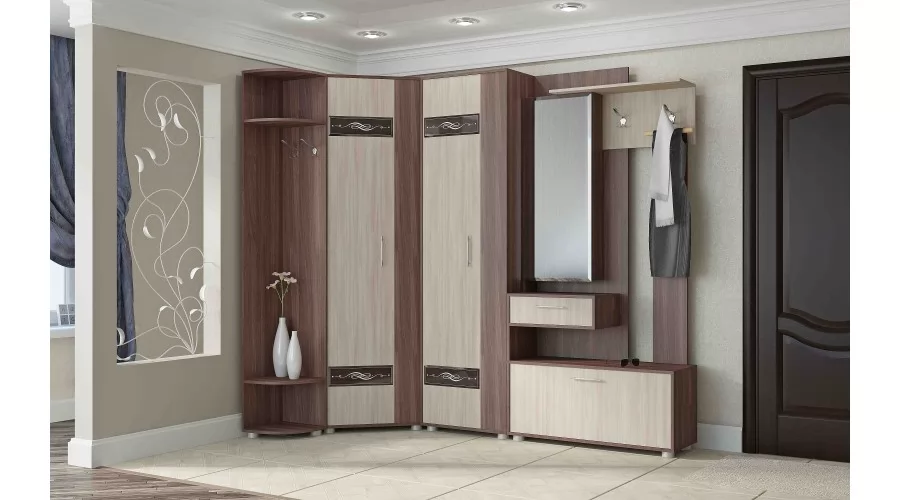Секция с зеркалом (зеркало имеет широкий фацет по периметру) может быть собрана как на левую, так и на правую сторону. Фасады шкафов универсальные и могут быть установлены в зеркальном отображении, что позволяет открывать шкаф как на левую, так и на правую сторону. В наполнение шкафа-пенала входит выдвижная штанга и четыре полки. В качестве дополнительного декора фасадов использовано декоративное стекло с широким фацетом и рисунком, окрашенное по специальной технологии, усиливающее глубину восприятия. Створка обувницы имеет два газ лифта, выдвижной ящик на роликовых направляющих, применены регулируемые по высоте опоры, высокопрочные крючки. Задние стенки и дно ящика выполнены из ламинированного и облагороженного ЛДВП в цвет корпуса.