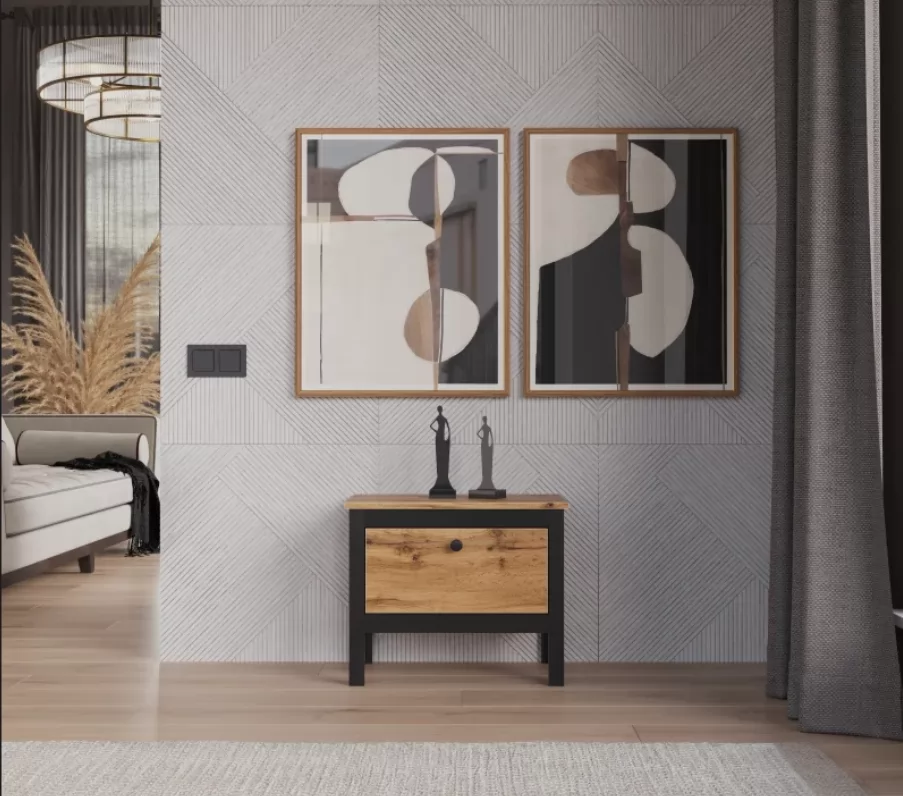 Модель выполнена из ЛДСП и проста в уходе. Достаточно протереть поверхность от пыли сухой тканью или слегка влажной тряпкой при устойчивых загрязнениях. Сочетание черного матового и древесного цветов делают этот модуль отличным решением для современных интерьеров.