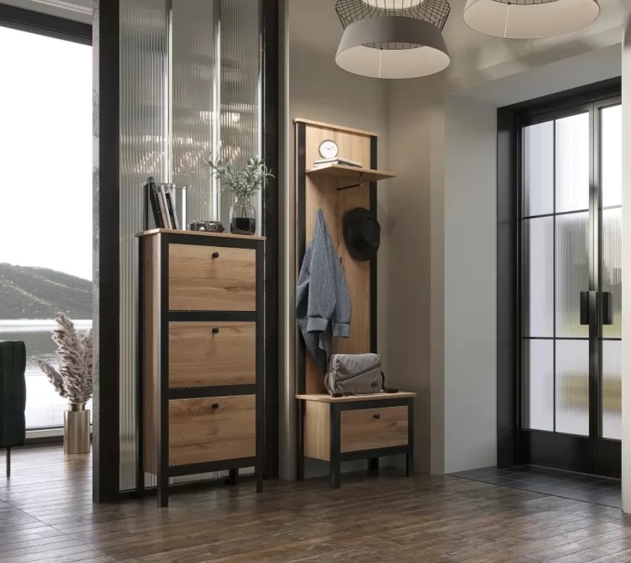 Тумба имеет откидную дверцу с металлической ручкой, которая предоставляет доступ к нише для хранения обуви. Столешницу можно использовать для хранения аксессуаров и ключей.