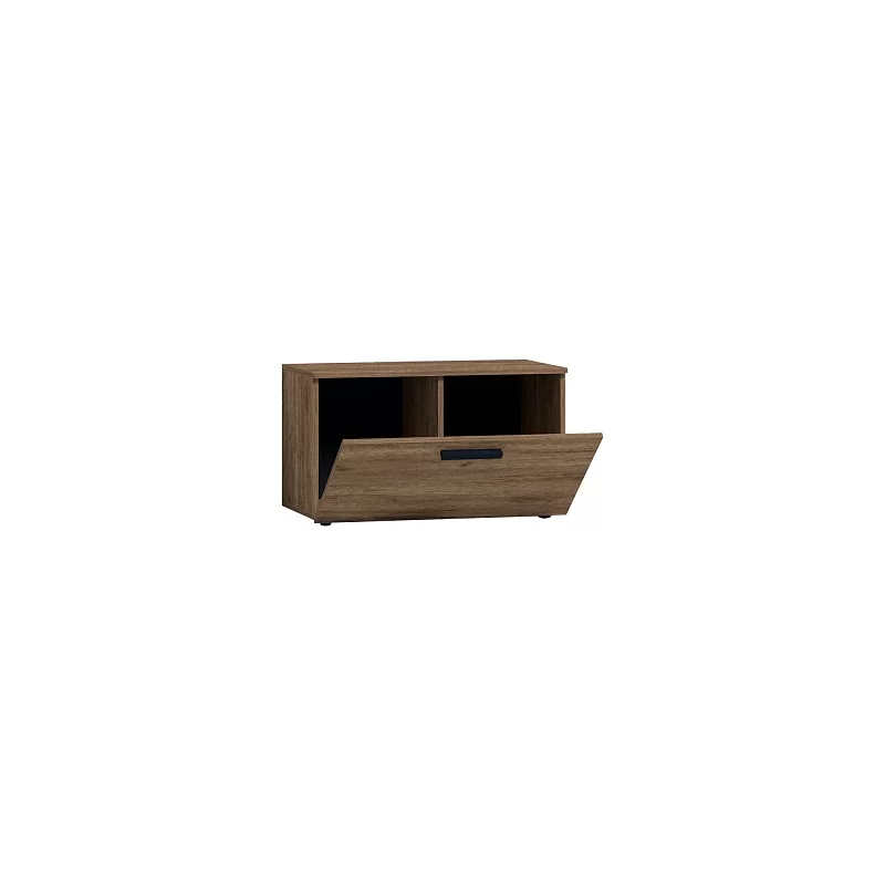 Небольшая тумба глубиной 389 мм поможет функционально обустроить прихожую в скандинавском стиле или стиле Лофт. За глухим откидным фасадом в декоре Дуб Табачный - 2 отделения. Регулируемые опоры компенсируют неровности пола.