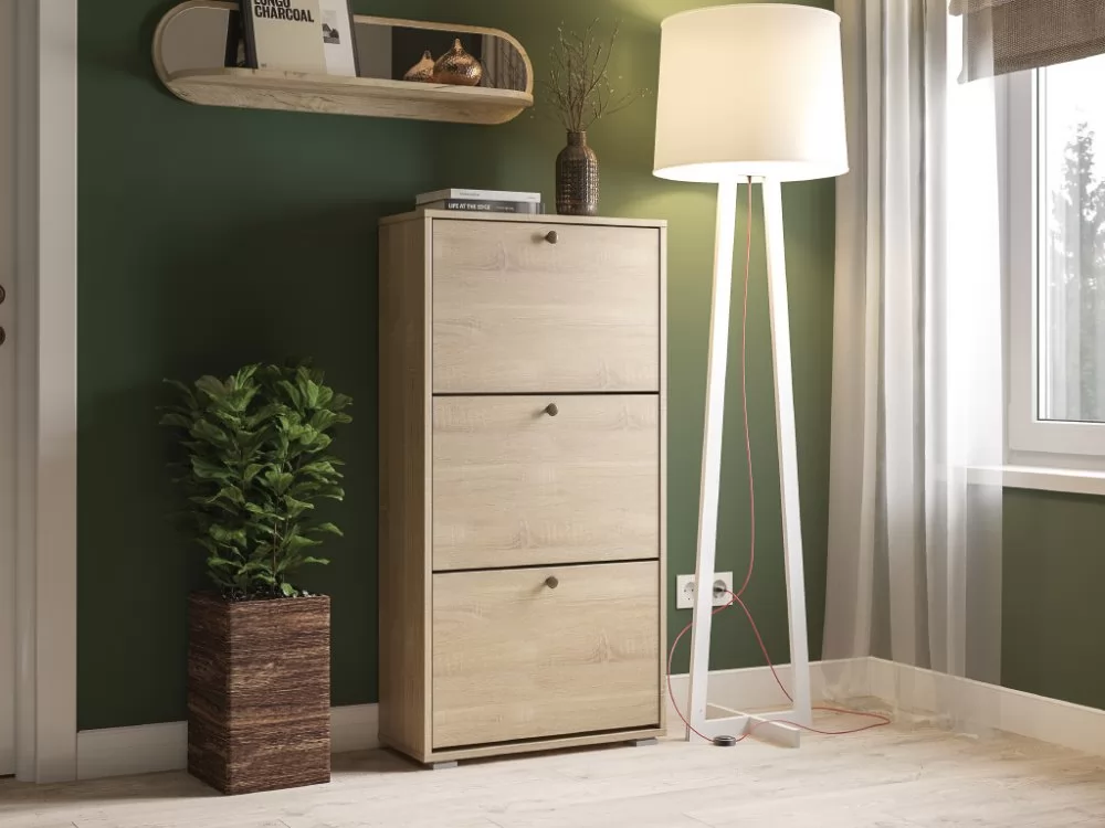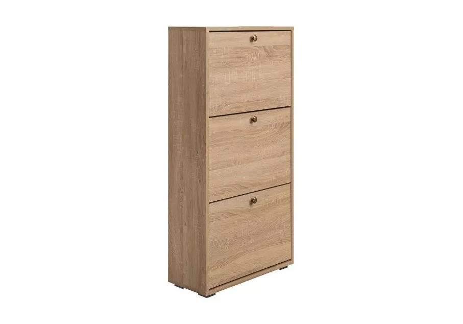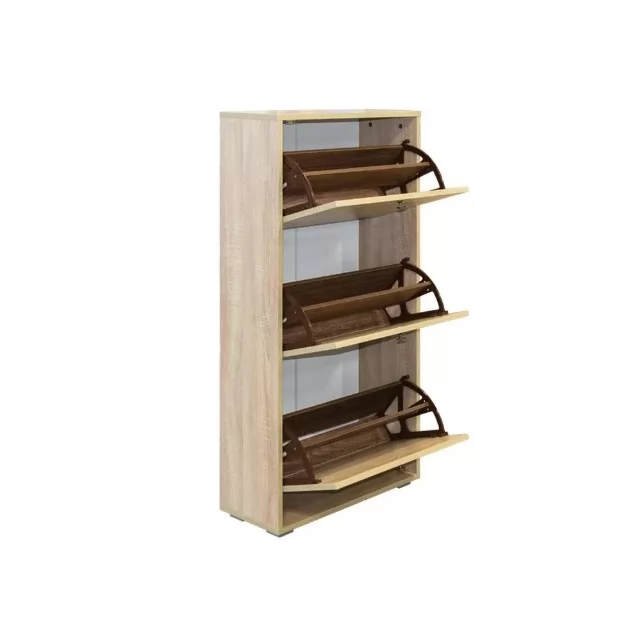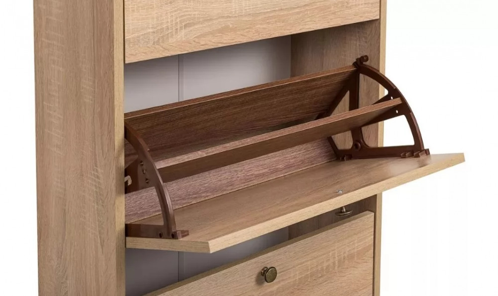 Конструкция тумбы для обуви представлена тремя откидными секциями, оборудованными специальными обувницами. Поверхность тумбы дополнительно можно использовать как туалетный столик, тем самым максимально использовав площадь в прихожей.
