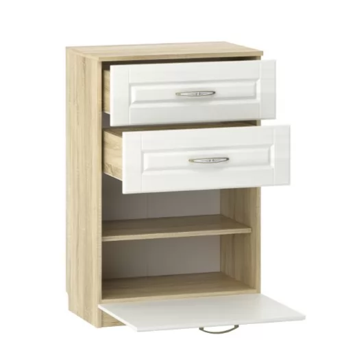 Тумба Оливия НМ 040.45 Х обеспечит аккуратное хранение обуви в прихожей. Для этого лучше всего подойдет нижнее отделение с полкой, скрытое за откидным фасадом. За счет встроенных газлифтов дверца открывается плавно. В верхней части тумба оборудована двумя выдвижными ящиками, в которых можно хранить средства по уходу за обувью, ключи.