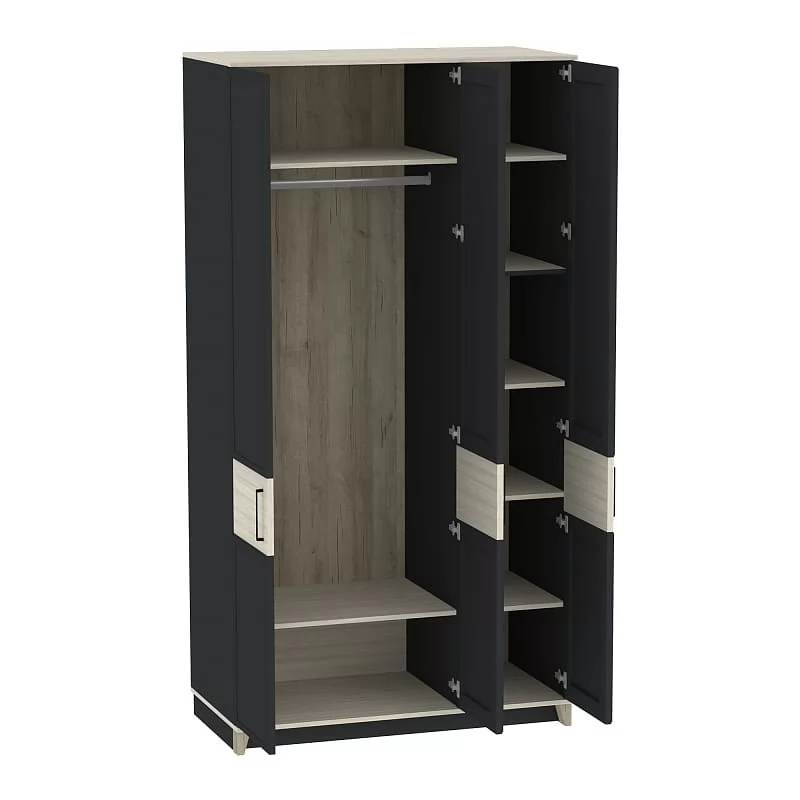 Ширина (мм): 1200 Высота (мм): 2308 Глубина(мм): 600 Материал: ЛДСП Цвет: Белый-Блеквуд Сатиновый,Антрацит-Блеквуд Сатиновый Металлические ручки Рамочные фасады из профиля МДФ Полки регулируемые по высоте