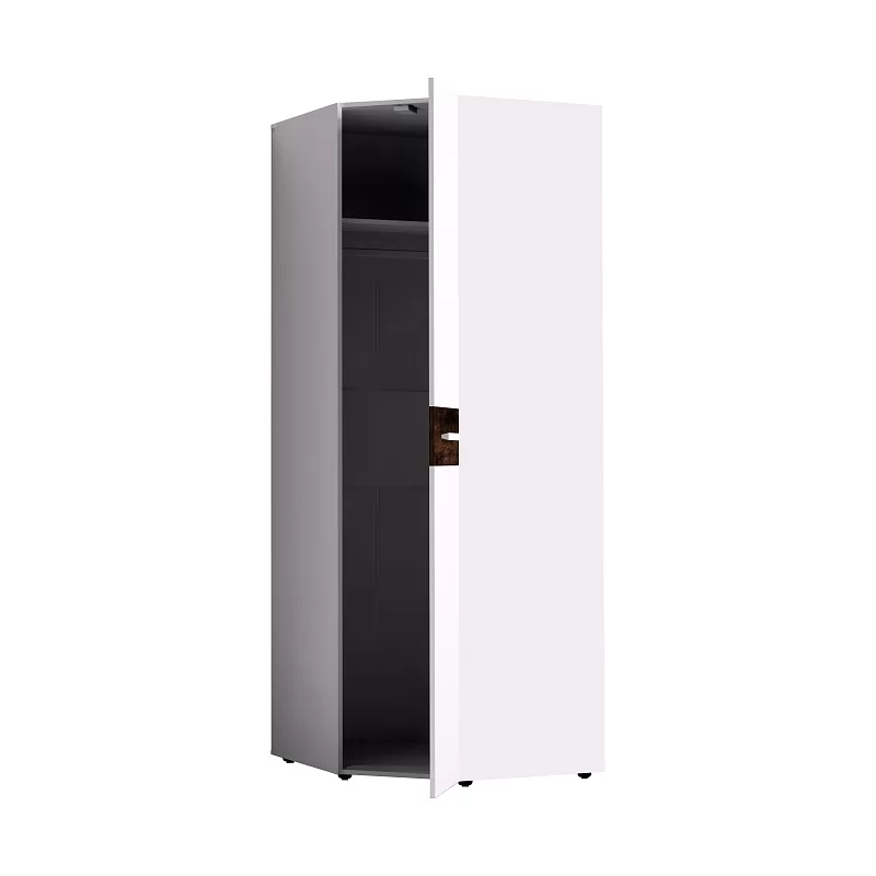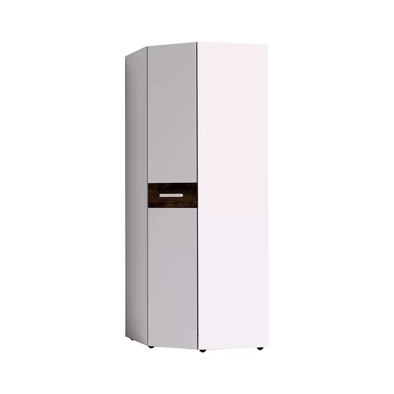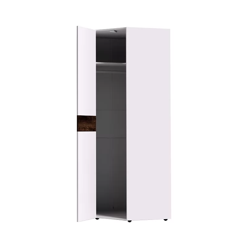 Норвуд 156 Шкаф угловой оснащен стационарной штангой, полочками для белья и беспроводным светодиодным светильником, который включается при открывании двери. Это особенно удобно, если нужно найти в шкафу вещи, не потревожив близких. Легкая установка на магнитное крепление - не требует сверления, прокладывания провода, подключения к сети. Глухой белый фасад с брашированной вставкой цвета Орех шоколадный открывается за ручку из массива. Фасад шкафа возможно навесить как на правую, так и на левую сторону.