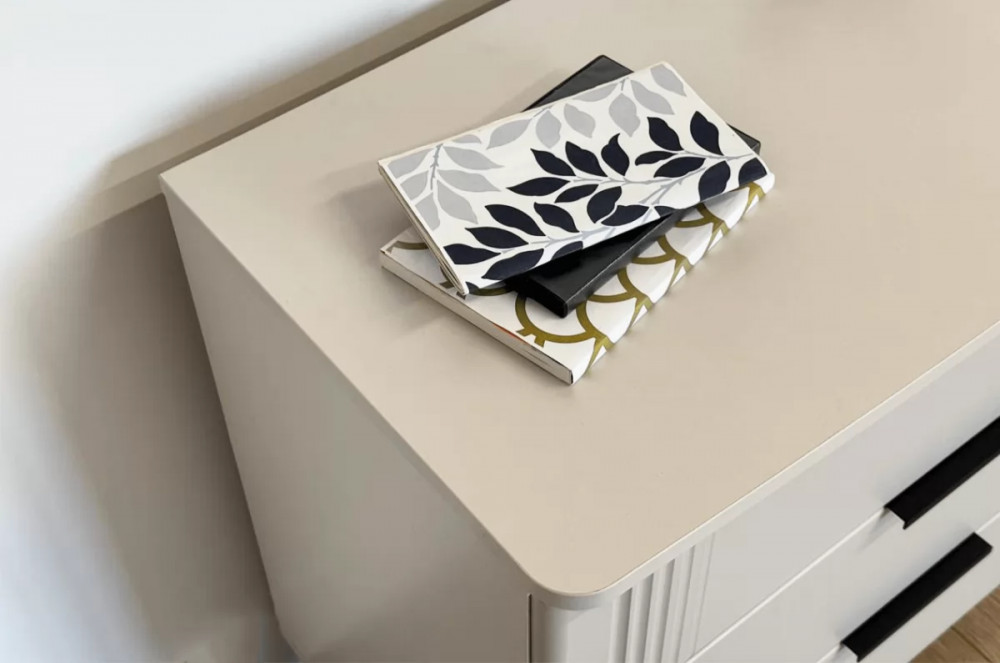 Комод изготовлен из качественных материалов: корпус выполнен из ЛДСП, что гарантирует прочность и долговечность, а фасад, выполненный из МДФ в плёнке ПВХ, не только выглядит эстетично, но и защищает комод от повреждений. Особое внимание заслуживает фрезеровка фасадов, которая придаёт изделию изысканный вид.