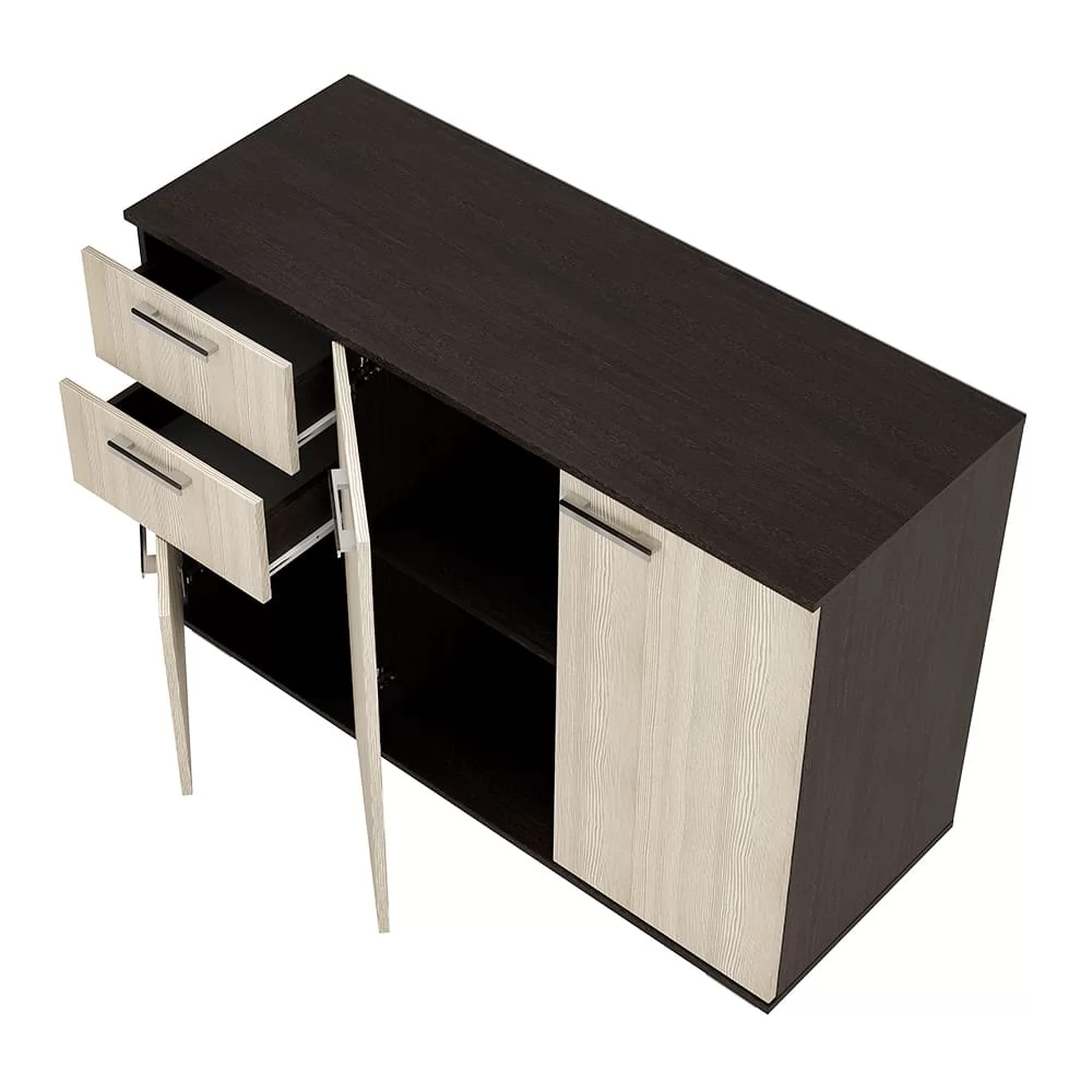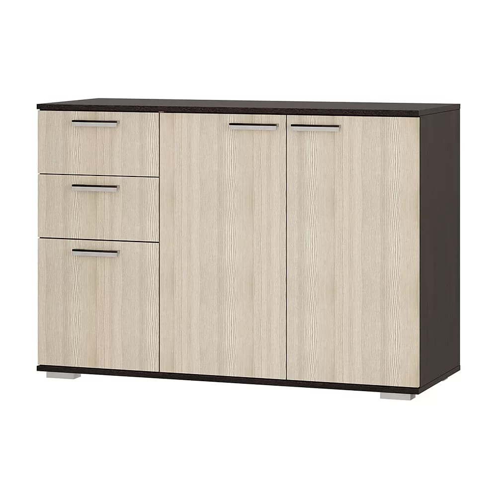 - основная часть изделия состоит из двух распашных дверок, за которыми находятся места для хранения вещей, - левая часть комода представляет собой два выдвижных ящика и нижнюю секцию также с распашной дверцей и полками, - модель Стандарт №3 выполнена из высококачественной ЛДСП в популярных оттенках венге и лоредо, - оснащена удлиненными хромированными ручками геометрической формы.
