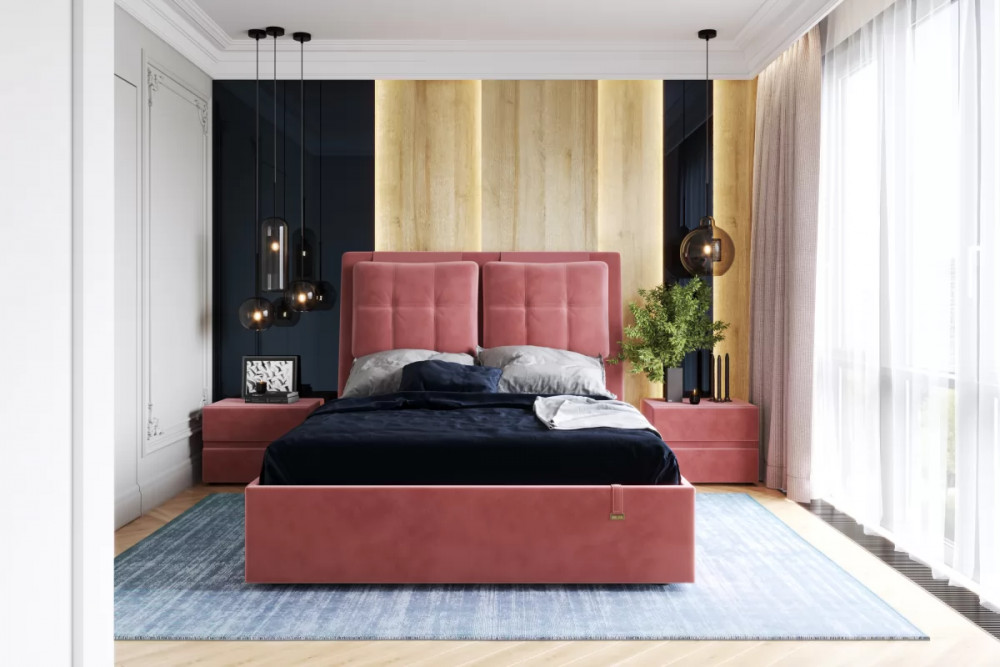 Кровати выполнены в нейтральных и в ярких тканях велюр, что позволяет подобрать подходящий вариант почти под любой интерьер. В качестве декора применяются декоративные подушки на изголовье.