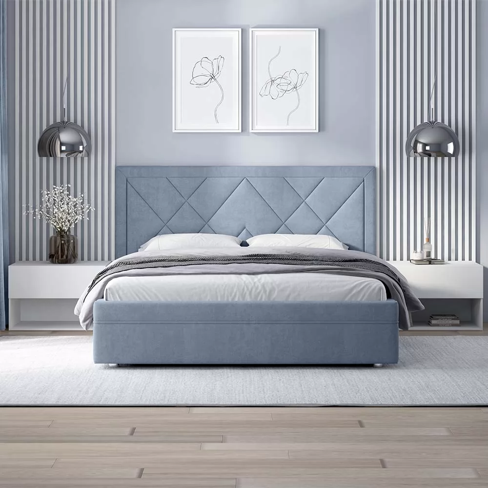 Эксклюзивная модель с мягким изголовьем, украшенным трендовым геометрическим дизайном. Такая модель на сегодняшний день пользуется большой популярностью у покупателей. Обладает всеми основными преимуществами, которые присутствуют у популярных моделей Marta и Jessica, т.е.: полный набор доступных опций, малый и большой ортопедический настил, сплошной настил из ЛДСП, комплектация подъемным механизмом.