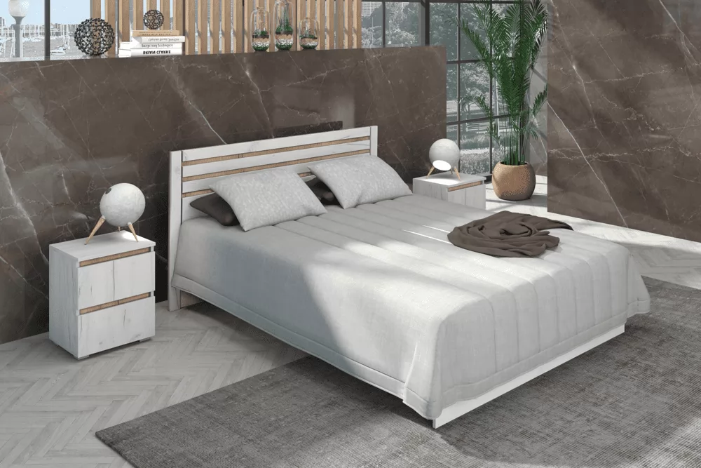 Изящная и функциональная спальня "Лиана" выполнена в модном цвете ЛДСП крафт белый с контрастными вставками цвета графит, либо крафт золотой. Кровать "Лиана" с настилом из ЛДСП рассчитана на нагрузку до 90кг на 1 спальное место. Матрас в комплектацию кровати не входит и приобретается отдельно
