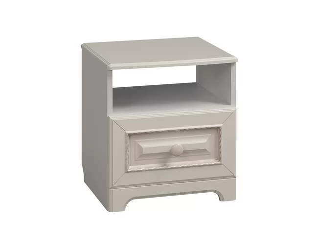 Прикроватная тумба – самый маленький, но в то же время незаменимый модуль серии «Белла». Используйте его как подставку для ночника, а также для хранения самых необходимых вещей как в открытой нише, так и в закрытом выдвижном ящике. Столешницу из МДФ украшает фрезеровка.