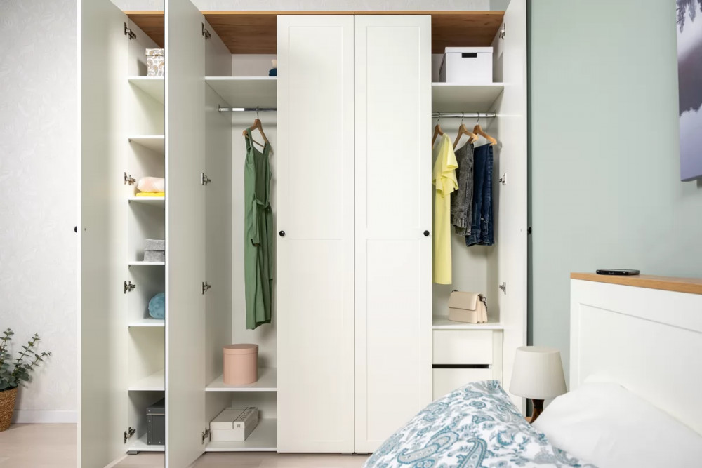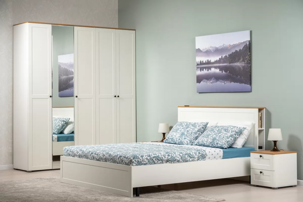 В изголовье кровати предусмотрены вместительные ниши. Шкафная группа полноценной глубины позволяет эффективно организовать систему хранения.