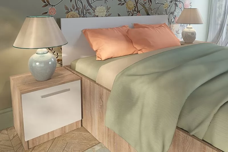 Корпус спальни изготовлен из 16 мм ламинированной древесностружечной плиты цвет –«Белый» и «Дуб Сонома». Торцевые поверхности корпуса закромлены кромками полипропилен. Фасады изготовлены из 16 мм ламинированной древесностружечной плиты цвет – «Белый» и «Дуб Сонома».