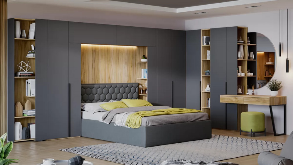 Спальный гарнитур «Порто» №3 Яблоня Беллуно, Графит софт, Велюр Confetti Stone в Кургане