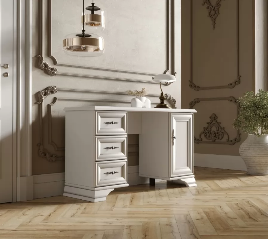 Столик стоит на изящных резных ножках, которые подчеркивают классический дизайн. Витиеватые ручки удачно дополняют фасад и привлекают внимание к деталям.